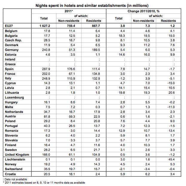 These estimates, which include nights spent whether for business or leisure, come from a publication2 from Eurostat, the statistical office of the European Union.