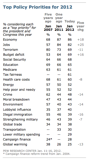 Washington DC., Jan 23, 2012 (Pew Research Centre Media Release) – As the 2012 State of the Union approaches, the public continues to give the highest priority to economic issues. Fully 86% say that strengthening the economy should be a top priority for the president and Congress this year, and 82% rate improving the job situation as a top priority. None of the other 20 issues tested in this annual survey rate as a top priority for more than 70% of Americans.