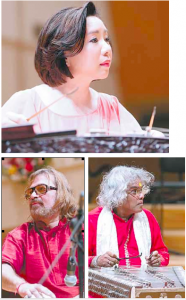 Chinese yangqin player Liu Yuening (top) collaborates with Indian santoor player Tarun Bhattacharya (below left) and tabla player Vijay Ghate at the East Meets East concert in Beijing. Photos provided to China Daily |