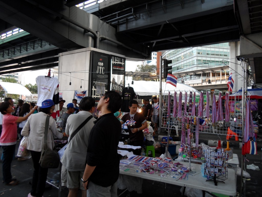 ![]() Souvenir sales to foreign tourists down? No problem. The enterprising Thai vendors made a quick switch to the far better selling nationalistic and anti-government memorabilia. |