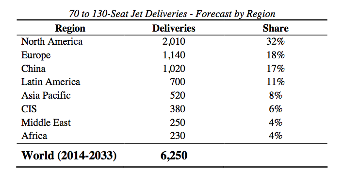 The Market Outlook identifies a need for 6,250 jet aircraft in the 70 to 130-seat capacity category (2,300 units in the 70 to 90-seat segment and 3,950 units in the 90 to 130-seat segment). Replacement of ageing aircraft will represent 56% of new deliveries and 44% will support market growth. The world fleet-in-service of jets with up to 130 seats will increase from 3,850 aircraft in 2013 to 6,580 by 2033. The value of all deliveries is approximately USD 300 billion (list price).
