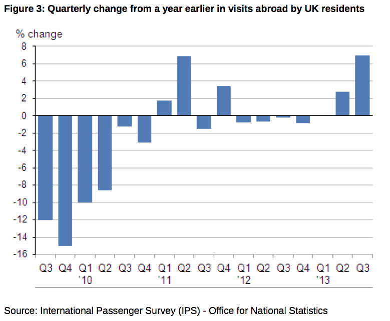 Says the UK National Statistical Office report for the third quarter 2013 period, published in January 2014, “In quarter 3 2013, there were 14.6 million (outbound from UK) holiday visits which was an increase of 6.8% compared to the same quarter a year ago. Visits to friends or relatives increased by 12.3% in this quarter, compared to the same period in 2012, and business visits fell by 4.8%.