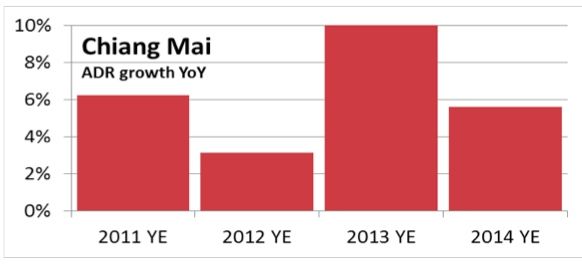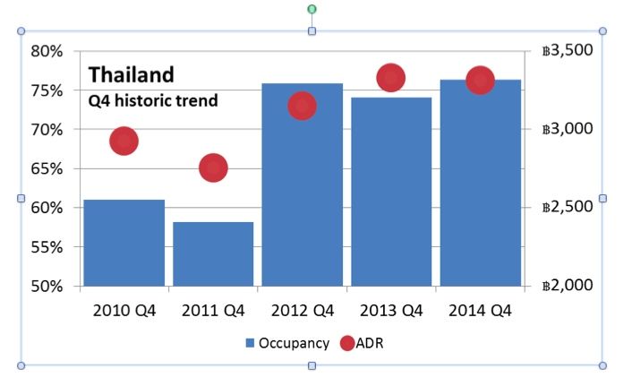 In local currency terms, average daily rate for Thailand as a whole in 2014 was up 2.6 percent year over year, with Bangkok once again proving that it is able to sustain rates throughout market turmoil. While there were hotels that lost significant rates, the fact that ADR ended flat year over year speaks volumes to the amount of hotels firmly holding their ground.