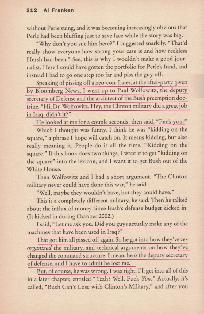 What did the Jewish neo-con (former U.S. Deputy Secretary of Defence Paul Wolfowitz) tell the Jewish humorist (Al Franken) when confronted about the fiasco caused by the 2003 U.S.-led attack on Iraq, and the non-existent weapons of mass destruction?
