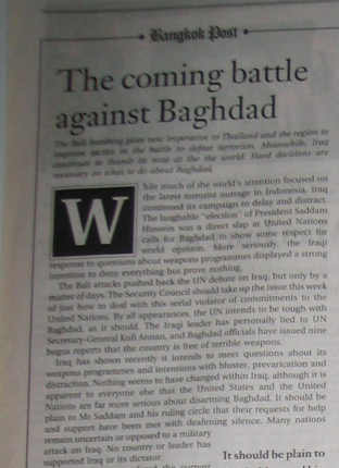Exposing the lies and the lying liars who tell them is my journalistic responsibility. Here, I want to brag about another professional achievement. I was the only journalist in Thailand to write a series of columns in the Bangkok Post opposing the then looming Iraq war and the Lying Liars pushing for it. Meanwhile, the Bangkok Post’s own editorials were cheerleaders for exactly the opposite. One editorial even heaped “kudos” on Tony Blair. Here are some examples of the Post’s editorials: