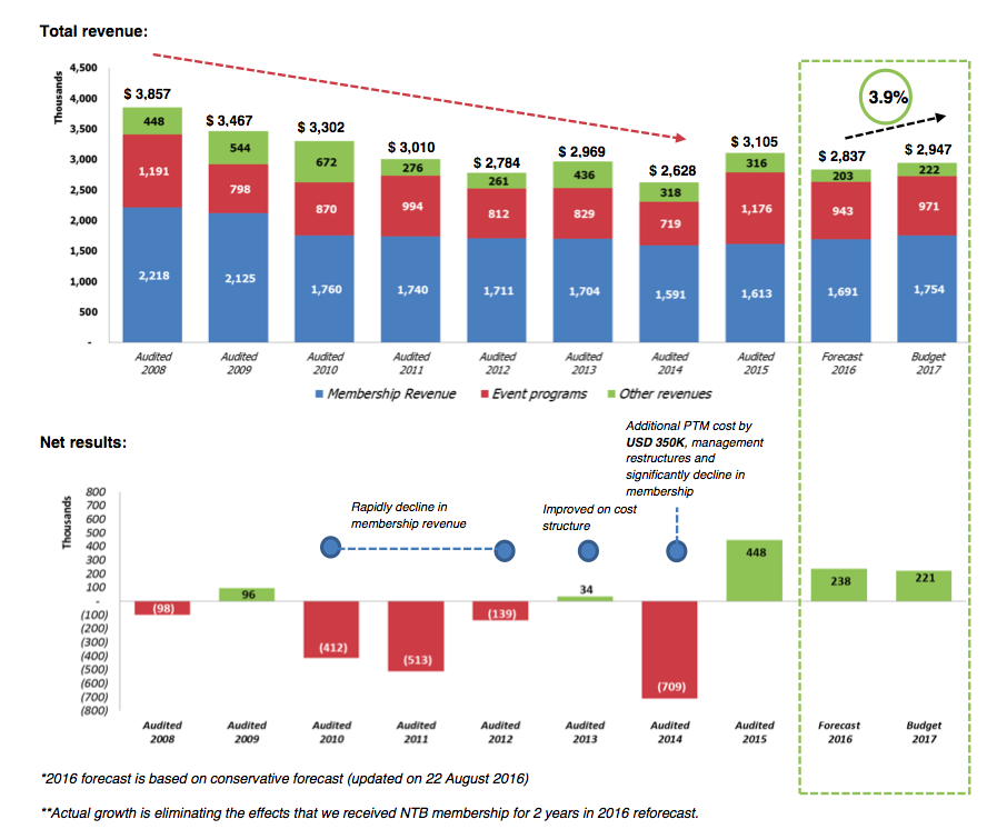 Financial reports presented to the board meeting indicated that the PTM 2016 is projecting revenues of US$646,179 and a bottom-line surplus of US$535,679. The Indonesian Tourism Ministry agreed to host the venue costs of US$140,000 and got 450 sq m of booth space. Total revenue 2016 projections for PATA as a whole are pegged at US$2.8 million, with a net surplus of US$238,000, by conservative estimates. The bottom-line could go up if all outstanding membership dues are collected partially or fully. PATA has set a full year membership revenue target of US$1.7 million. As of August, US$324,000 was still in arrears from 145 members, including 22 NTOs and 11 airlines.