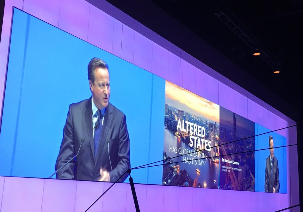 UK Prime Minister David Cameron, the lead keynote speaker, picked up on the theme with a speech that was almost entirely focussed on geopolitical global warming. His theme was “Altered States — Has Globalisation had its Day?” He sought to explain the rise of populism and the increasing call for protectionism, the challenges facing global diplomacy as power bases shift to emerging economies, migration, both voluntary and forced, economic growth and globalisation, and the role of governments and business in working towards a more sustainable future.