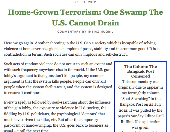 I am raising these issues from a position of unmatched strength. I claim to be the only journalist in Asia to have warned explicitly over the years that America’s love-affair with violence will never end, NEVER. This assertion was repeatedly made in a former column called Soul-Searching which I wrote for the Bangkok Post for 15 years. The Bangkok Post gagged the column in July 2012. In protest, I uploaded the last unpublished column on my website here (along with many other earlier columns which can be read by clicking here):