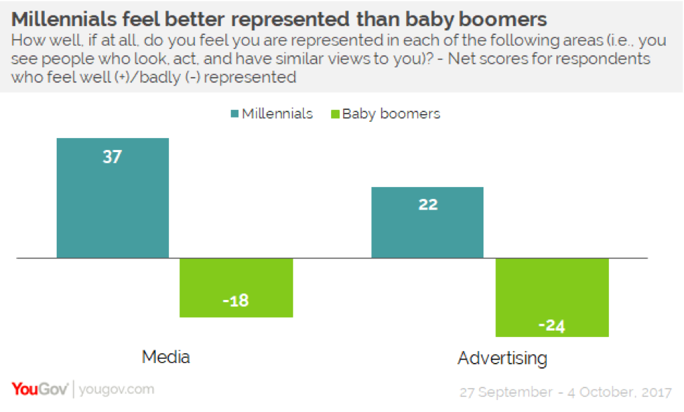 The online survey comparing the opinions of respondents born between the mid-1940s and mid-1960s (baby boomers) and between the early 1980s and mid-1990s (millennials), asked how well represented they feel by the way they see people look, act and have similar views to them in the media and advertising.