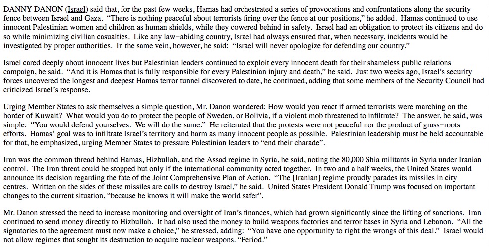 Today, this power is on full display. A “proud and unbowed” Israeli army defends Israel by shooting unarmed Palestinians at will, including women and children. Clearly above the law, the nuclear-armed country does not fear any international condemnation nor sanctions nor any other form of judicial, economic, political, diplomatic or military action. When the Israeli killings were raised in the UN, the Israeli ambassador called the Palestinians “terrorists” and denigrated their protest as a “shameless public relations campaign.” Read his statement here, as reported by the UN itself: