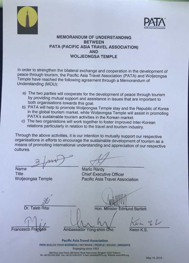The agreement was one of the symbolic highlights of the PATA Annual Summit held in Korea, an event that fortuitously assumed enormous added importance against the backdrop of a peace outbreak on the Korean peninsula. The temple itself is located about an hour’s drive from the Lakai Sandpine Resort, venue of the PATA summit.