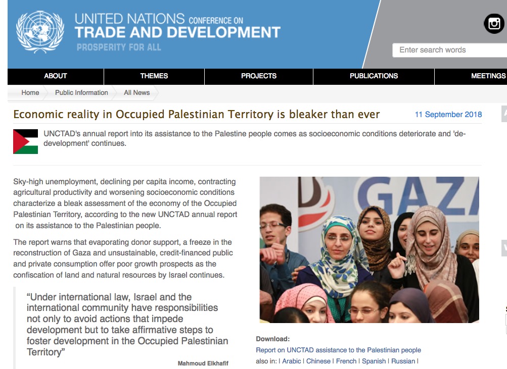 Geneva, 12 September 2018 (UNCTAD news release) – Unemployment in the Occupied Palestinian Territory rose to more than 27 per cent – the highest rate in the world – while per head income declined and agricultural production contracted by 11 per cent, as socioeconomic conditions in the past year worsened, according the latest UNCTAD annual report on its assistance to the Palestinian people.