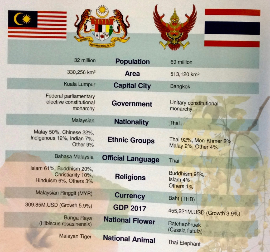 On the Thai side of the 647-kilometre border are the provinces of Narathiwat, Yala, Pattani, Songkhla and Satun. On the Malaysian side, the states of Kedah, Kelantan, Perak and Perlis, which once used to be under Thai protectorate. Their combined social and cultural heritage is bolstered by economic resources of rubber, palm oil and tourism. Their peoples are bound by two religions of peace, Buddhism and Islam.