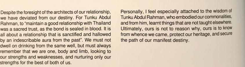 In fact, the bilateral connection goes back even further. Thai Ambassador Chawan Chawanid (term of service in KL, 1984-1989) recalled that Tunku Abdul Rahman Putra (1903-1990) the then Prime Minister and Foreign Minister of Malaysia, was the product of a Thai-Malaysian marriage. He was the seventh son of Sultan Abdu Hamid Halim Sha of Kedah, (entitled Chao Phraya Ritthisongkram Ramabhakdi Sri Sultan of Saiburi in the pre-1908 Siamese order) and Che Mangalalara (Nueng Nandanakara), whose father was Luang Naraburirak, a Siamese district officer in Nonthaburi. The Tunku went to school in Bangkok and his “early childhood was imbued with a sense of Thai Muslim cultural heritage.” In 1985, just five years before his death, he made a trip to visit the descendants of Kedahans in Nongchok, Bangkok.