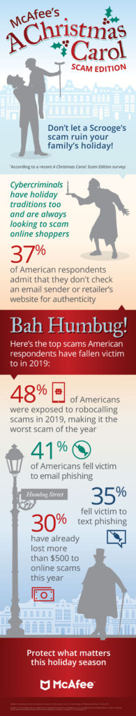 SANTA CLARA, Calif., 19 November 2019, BUSINESS WIRE – Today McAfee, the device-to-cloud cybersecurity company, announced findings from its recent survey, A Christmas Carol: Scam Edition, revealing that nearly half (48%) of Americans have been a victim of or know someone who has been a victim of robocalling in 2019, making it the worst scam of the year and one to watch out for this Holiday season.