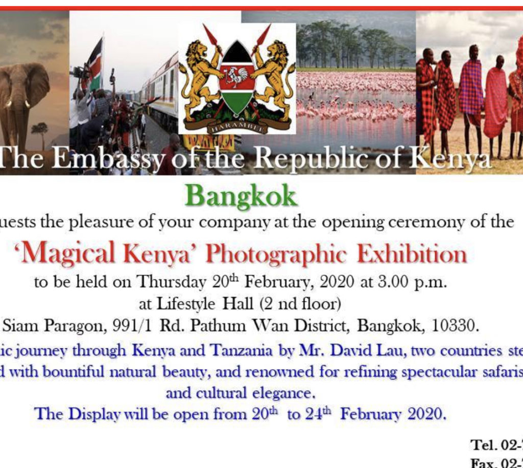 The exhibition of more than 100 photographs taken in the national parks of Kenya and Tanzania was held at the Siam Paragon shopping mall in central Bangkok. At the launch, guests were given a copy of a printed publication with the photographs. In his introductory message, David said he was fascinated by the amazing wildlife and cultural diversity. “The feeling of space and peace with only the sounds of birds and animals and wide-open vistas, watching those amazing animals doing what they do best in their natural environment was one of the best experiences of my life and a memory that will stay with me for a long time.