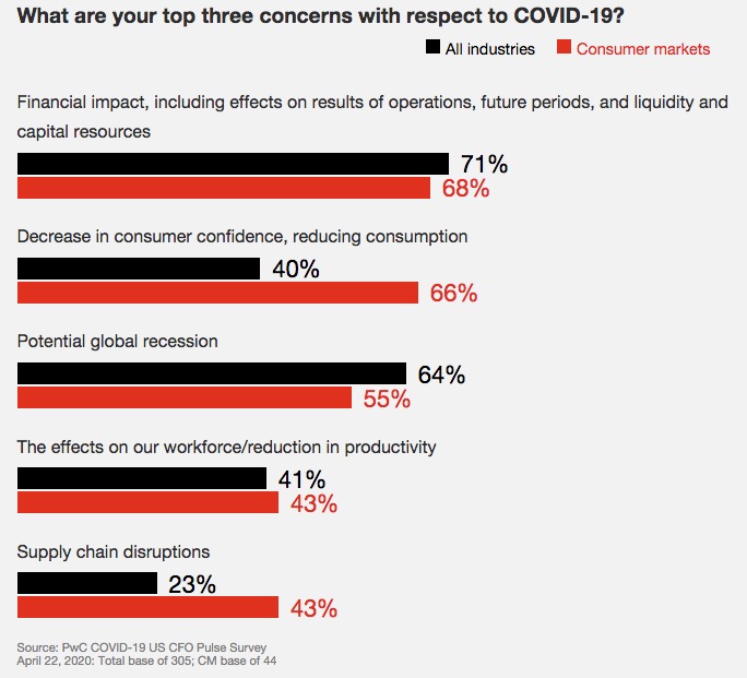 PwC surveyed 305 US CFOs and finance leaders between April 20-22, 2020. 89% of the respondents were from public and private companies in these top five sectors: consumer markets (14%), financial services (20%), health industries (12%), industrial products (23%), and technology, media and telecommunications (20%). 57 respondents are from Fortune 1000 companies. The PwC COVID-19 CFO Pulse Survey is taking place biweekly to track changing sentiment and priorities. The first iteration of the Pulse Survey was conducted March 9-11, 2020 the second took place from March 25-27, 2020, and the third was taken between April 6-8. You can view all findings and insights by visiting pwc.com/us/covid-19-survey.