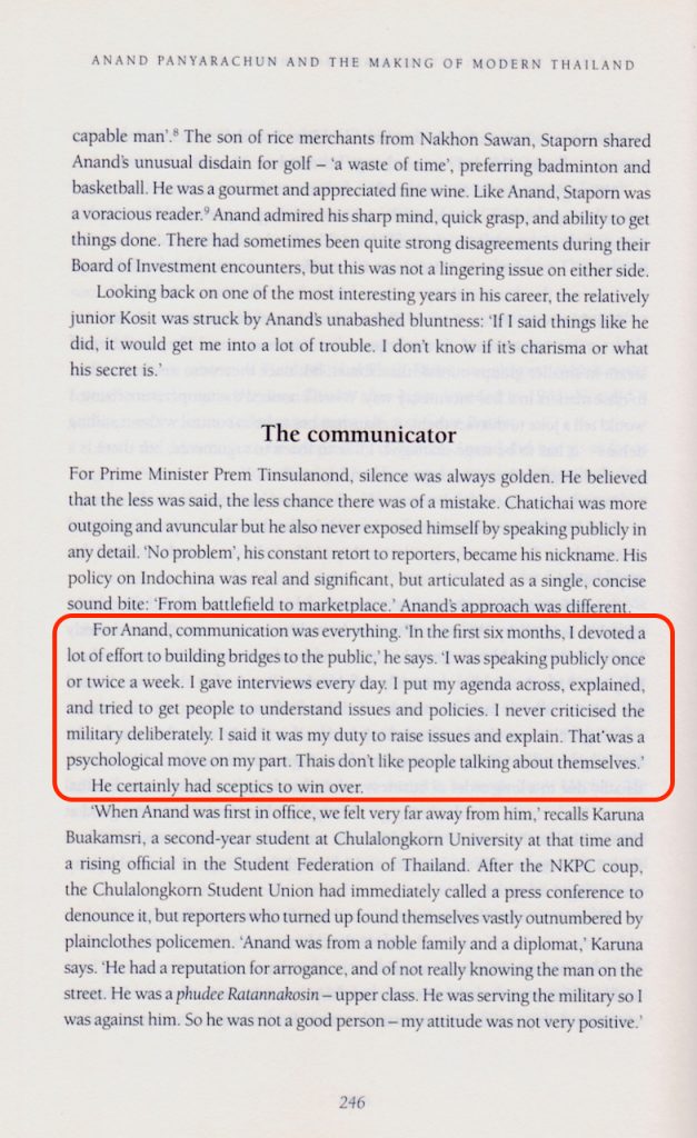 The book makes fascinating reading for those who lived through that fractious period. The detailed interactions between dozens of characters would put even a work of fiction to shame. Every chapter contains lessons relevant to the crafting of a “New Normal”. Because Thailand has never had a leader of equivalent family pedigree, education and local, global and international experience in both public and private sectors, this historical record of Mr Anand’s people-management and problem-solving approach deserves detailed study in corporate offices, universities and think-tanks.