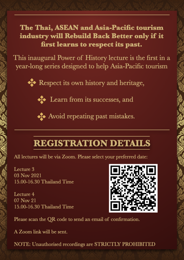 As Thailand is reopening to tourism, a look back may help us look ahead more clearly. I am proud to be the first to launch this “Power of History” lecture series. All will be FREE but BY INVITATION ONLY.