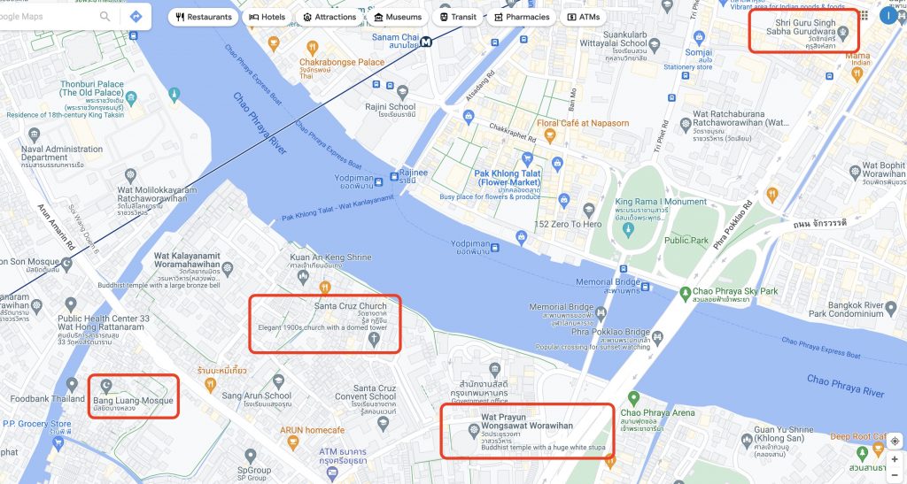 First, I did a random check to see if any of the three places of worship were on the Bangkok visitor experience trail. I found none.