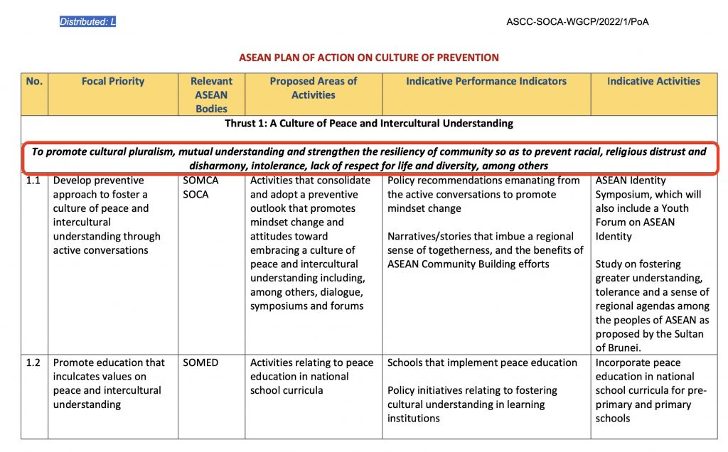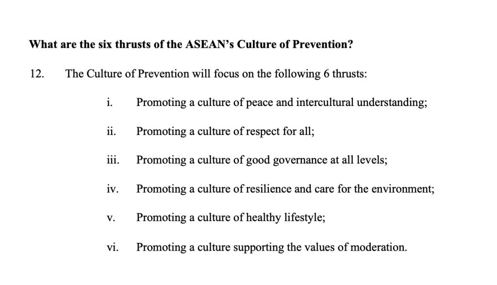 In 2017, ASEAN leaders also signed off on a “Declaration on ASEAN Culture of Prevention for a Peaceful, Inclusive, Resilient, Healthy and Harmonious Society”. This says: