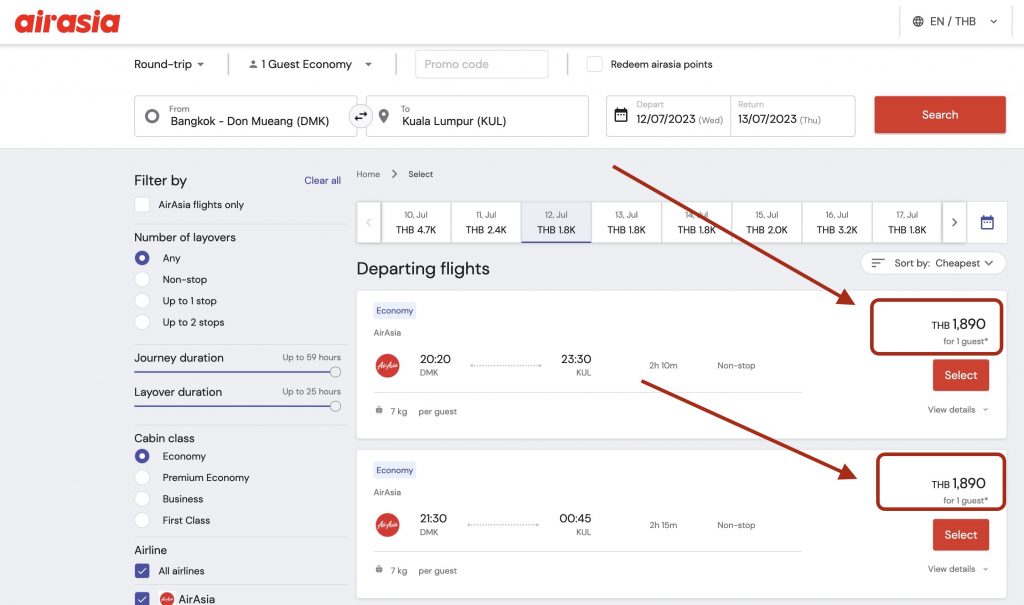 Knowing that the algorithm would be at work in the background, I checked both websites twice. On the first log-in, both airlines showed the same fare. On the second, the AirAsia fare dropped by 200 baht. The MYairline fare remained the same.