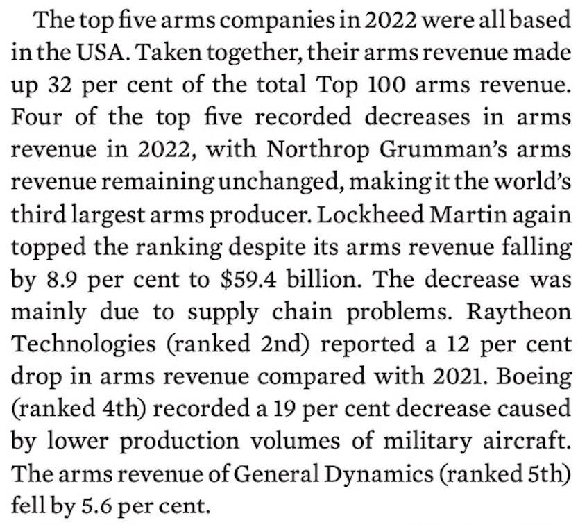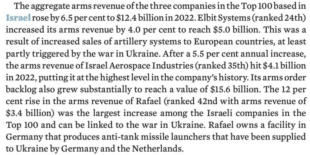 According to the SIPRI report, the Israeli companies’ earnings rose even though the combined arms revenue of the world’s 100 largest arms-producing and military services companies (the SIPRI Top 100) dropped 3.5% over 2021 to $597 billion in 2022. The report says that Russia’s invasion of Ukraine drove increased demand for weapons but “many arms companies’ efforts to increase production capacity were hindered by labour shortages, rising costs and supply chain disruptions. Outstanding orders and a wave of new contracts signal that global arms revenue could grow substantially in the next few years.”