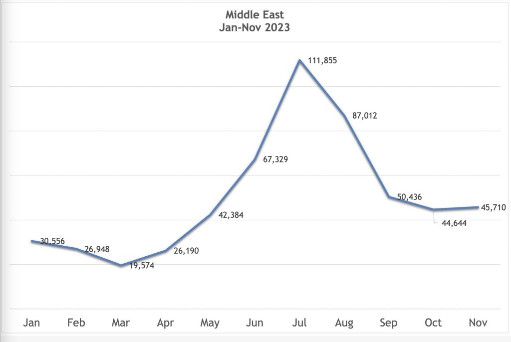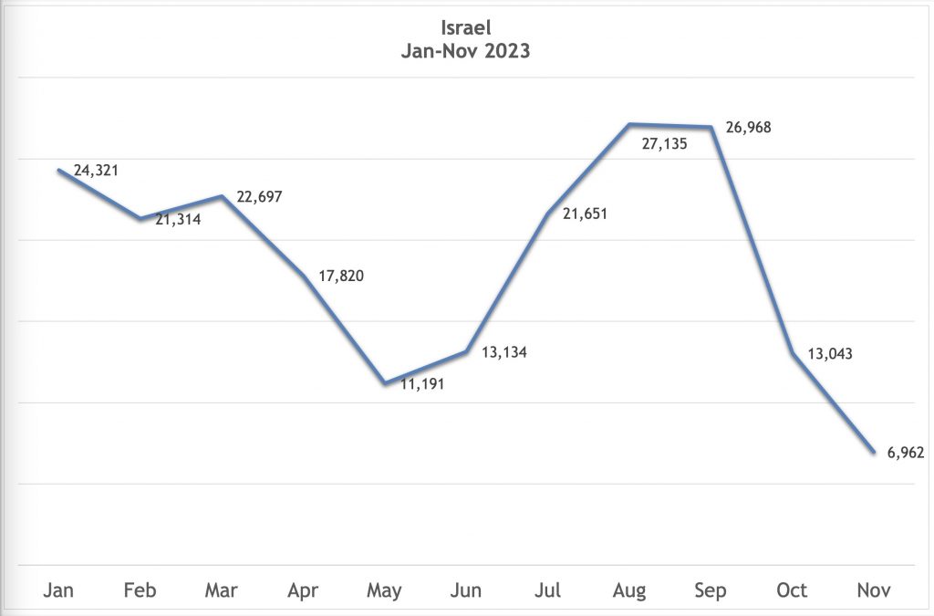 Like Europe, this is an extremely seasonal market, with small numbers emanating from multiple countries but high spenders. It, too, is likely to be hurt if the Israel-Palestine conflict worsens.