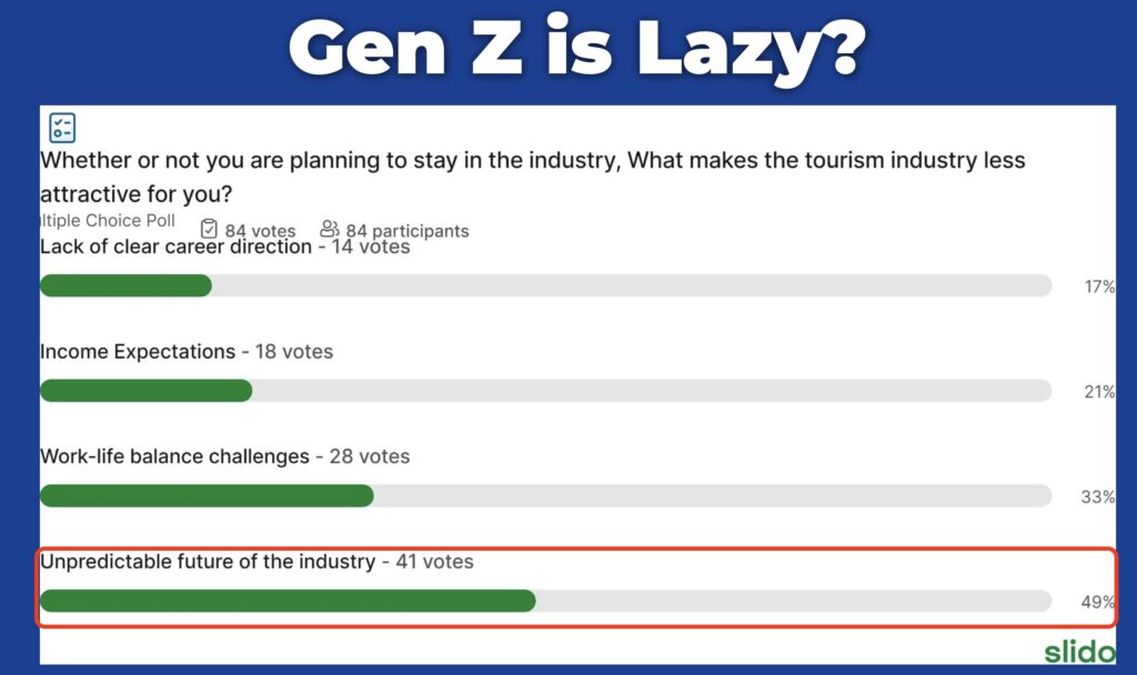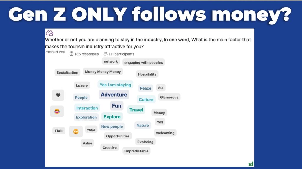 He asked what attracts them to a career in Travel & Tourism. The answers (see slide below) clearly distinguish Travel & Tourism from other economic sectors which offer none of those. Gen Z is not in it just for the money. Nor are they lazy and self-centred.