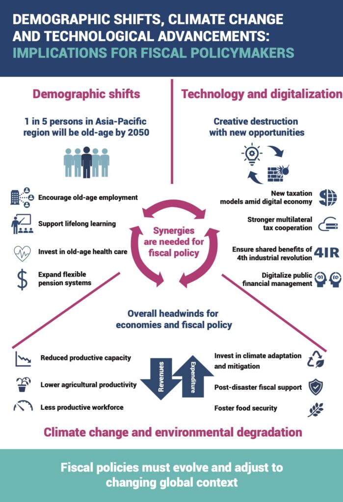 1. Population ageing: A shrinking workforce and lower labour productivity among older workers could hamper tax collection. Fiscal needs for old-age health care, social protection and lifelong learning will rise. Fiscal policy could also become less effective, as consumption by older people is less responsive to fiscal incentives.