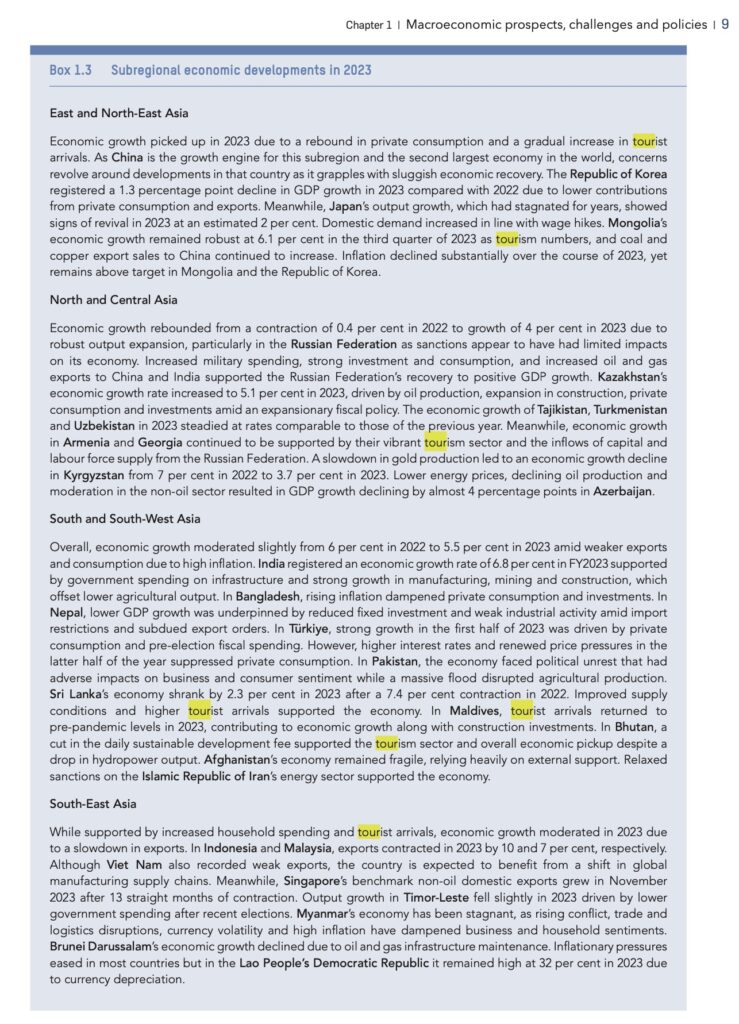 Says the report, “Global services trade particularly in tourism has seen an uptick with the continuing recovery from pandemic restrictions on travel. Tourism recovery strengthened in 2023 with arrivals in the Asia-Pacific region rising on average to about 62 per cent of pre-pandemic levels. Tourist arrivals have climbed back to pre-pandemic levels in Armenia, Fiji, Georgia, Kyrgyzstan, Maldives, Türkiye and Uzbekistan. In tourism-dependent countries in South-East Asia, the return of arrivals has reached approximately 70 per cent of pre-pandemic level. In the Pacific, tourism has been a key driver of GDP growth, particularly for Cook Islands, Fiji, Palau and Samoa.”