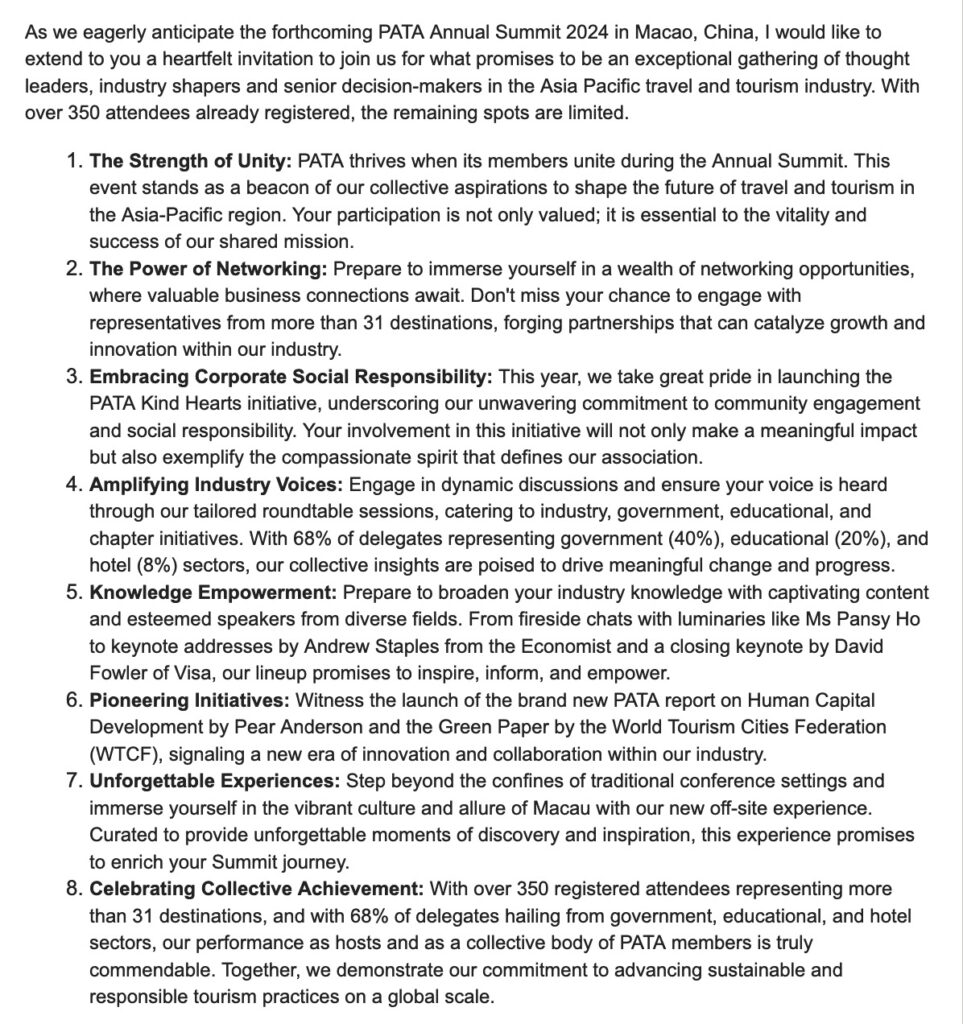 In a message to PATA members on 29 April, PATA CEO Noor Ahmad Hamid outlined this eight-point listing of his hopes and expectations from the summit: