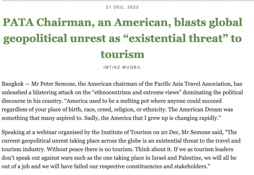 In September 2023, he attended a forum in Bangkok at which I presented a plan on promoting Peace Tours in Thailand. On 20 December 2023, against the backdrop of escalating violence in the Middle East, Mr Semone spoke up, describing the violence as an “existential threat” to tourism.