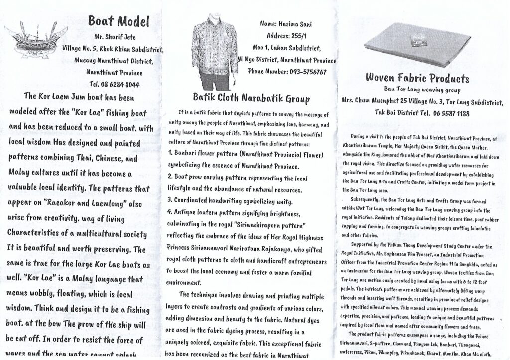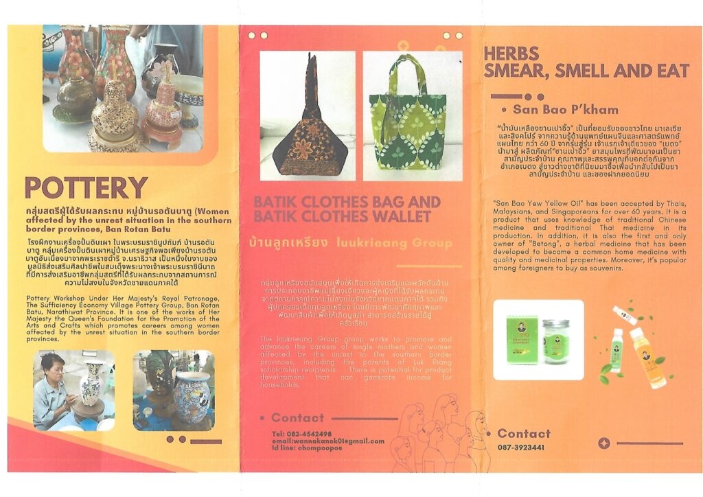 The itinerary, planned and organised in cooperation with the Southern Border Provinces Administrative Centre (SBPAC) and the provincial authorities of Pattani, Yala and Narathiwat, included stops at several places where local entrepreneurs were given an opportunity to showcase their products. These ranged from batik apparel, health and wellness products, medical supplies, footwear, food snacks, and much more.