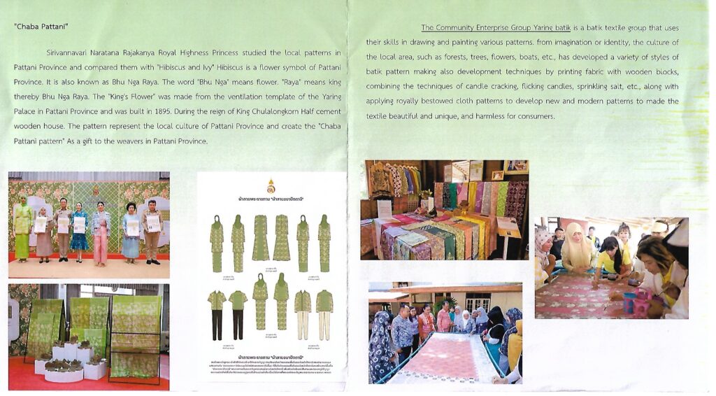 HRH Princess Sirivannavari Nariratana Rajakanya, daughter of His Majesty King Rama X, is also supporting the design and production of batik cloth and apparel. On the occasion of her 36th birthday, Princess Sirivannavari created the “Chaba Pattani” pattern, inspired by local Pattani designs and the hibiscus flower, symbolizing the province. This pattern is a gift to Pattani weavers to enhance their identity and sustain local crafts. The creation includes six designs for royal day and night gowns. The hibiscus, or “Bhu Nga Raya” (King’s Flower), is featured in the pattern, originating from the Yaring Palace’s design in Pattani.