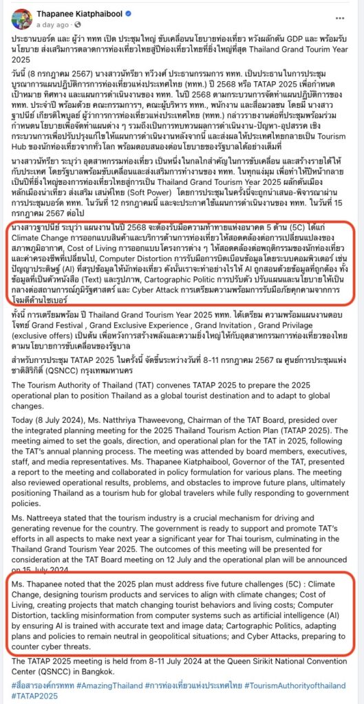 Bangkok – The Tourism Authority of Thailand has publicly recognised global geopolitics as a threat to the future of tourism in the post-Covid era. Officially posted by the TAT Governor Mrs Thapanee Kiatphaibool on her Facebook page on 08 July 2024, the official recognition of this threat paves the way for it to be openly discussed and debated in industry forums, locally, regionally and globally.