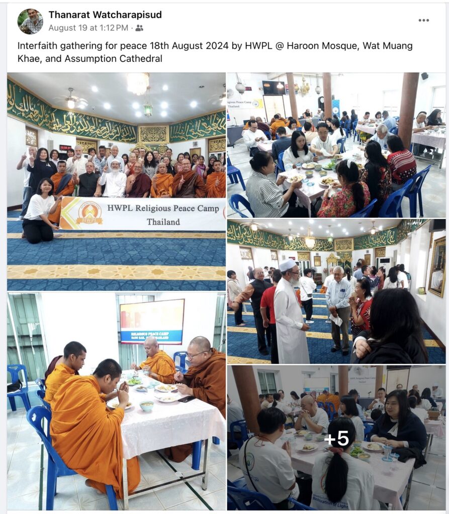 Another interfaith peace-building event by the Young Gen was held on August 18, the Thai branch of the Korean-based peace organisation, HWPL (Heavenly Culture, World Peace, Restoration of Light). It organised religious peace camps including visits to Haroon mosque, Muang Khae Temple and Assumption Cathedral. Its three objectives were: 1. Share a case of maintaining interfaith peace in Thailand. 2. Provide the opportunity to experience various religions. 3. Promote Thailand’s exemplary interfaith harmony to the global society.