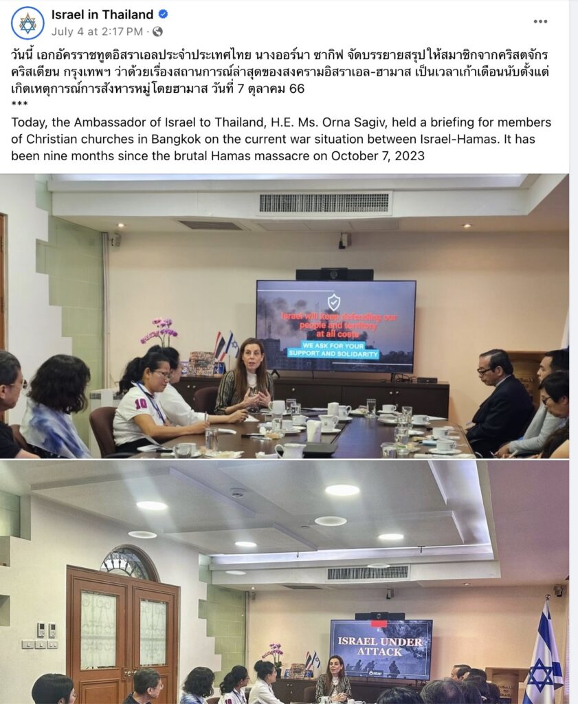 In spite of that, in July, the Israeli ambassador went directly to the Thai-Christian groups to rally their support.