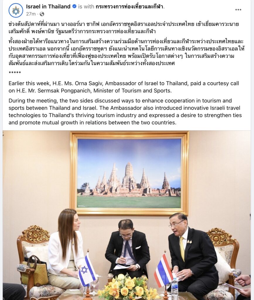 This is the way the July 31 meeting between Minister Mr. Sermsak Phongphanich and Ambassador Mrs Orna Sagiv was reported on the Israeli embassy’s facebook page. The two-para report gave just a broad brushstrokes account.