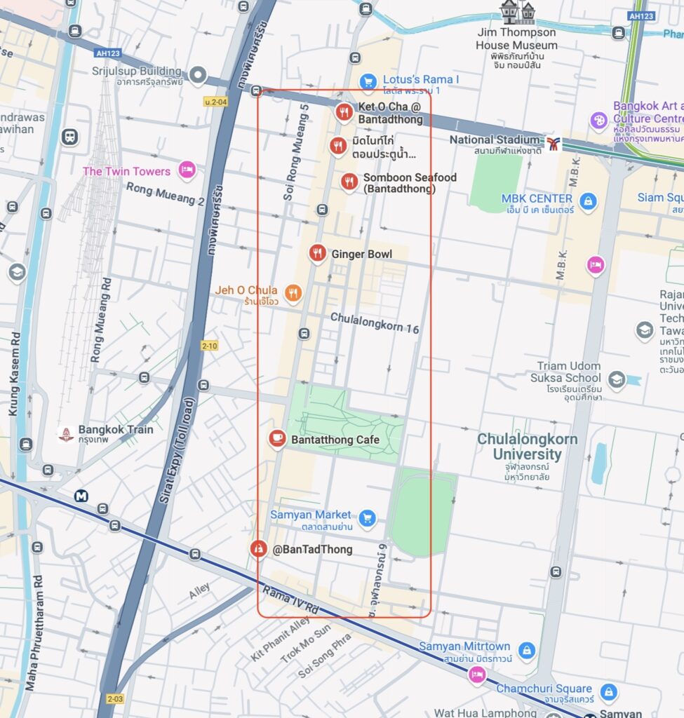 The popular Bantadthong Food Street was chosen because the eateries are already very popular, many of them family-owned with a rich history heritage in their own right. It contains no big hotels or shopping complexes requiring vehicular access. It is close to both the Skytrain and MRT Underground stations and right next to Chulalongkorn University, whose students provided massive social-media marketing support. To maximise space usage and freedom of movement, the Walking Street was kept free of stalls selling products.