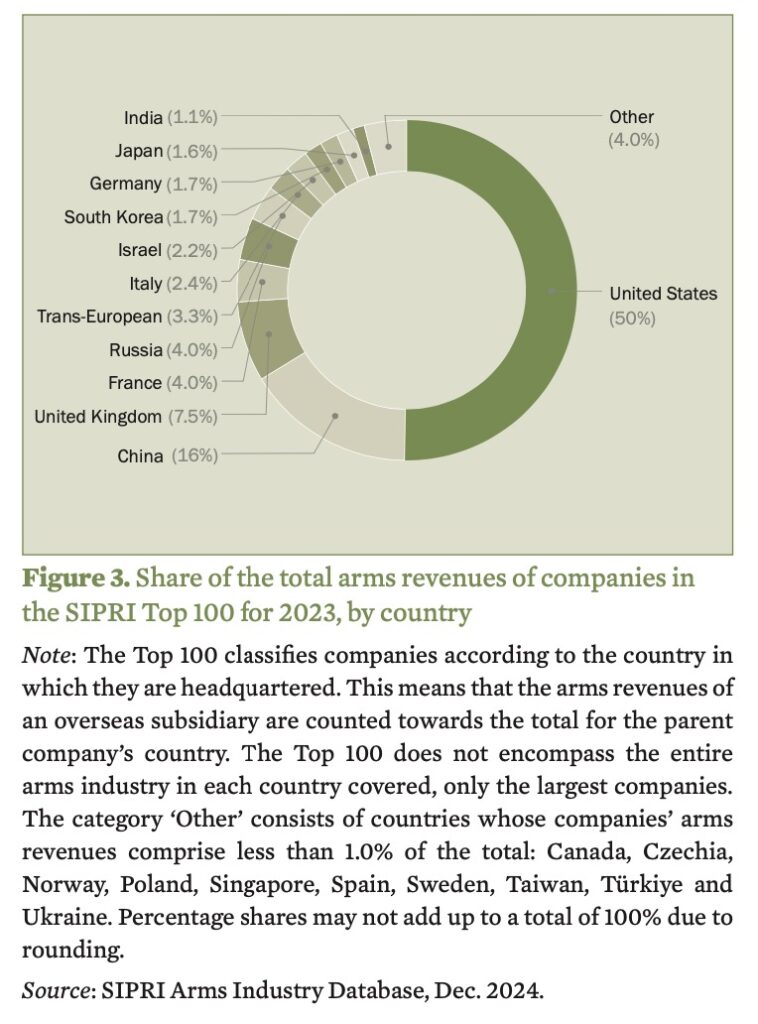 (+) The nine companies in the Top 100 based in China saw their smallest year-on-year percentage increase in arms revenues (+0.7%) since 2019 amid a slowing economy. Their total arms revenues in 2023 reached $103 billion.