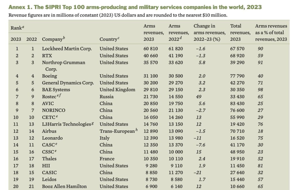(+) U.S.-based companies are the biggest beneficiaries, comprising 41 of the companies in the Top 100. They recorded arms revenues of $317 billion, half the total arms revenues of the Top 100 and 2.5% more than in 2022. Since 2018, the top five companies in the Top 100 have all been based in the USA.