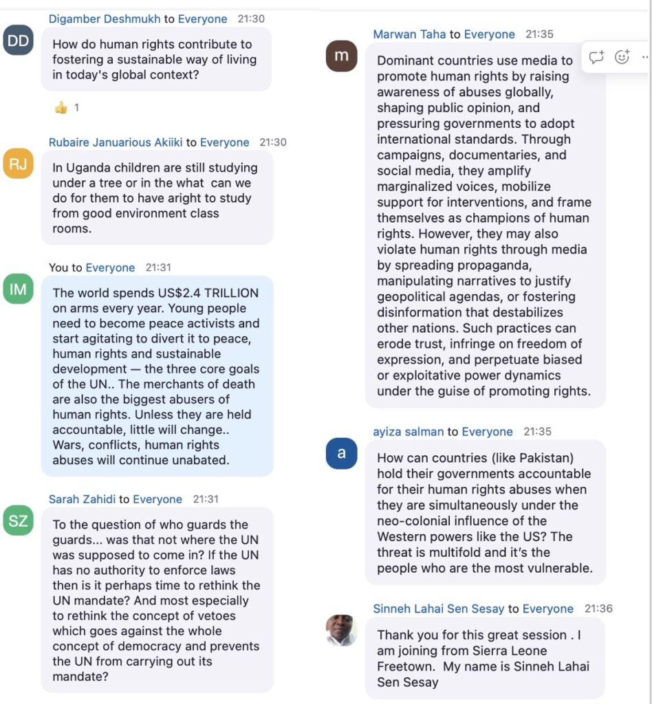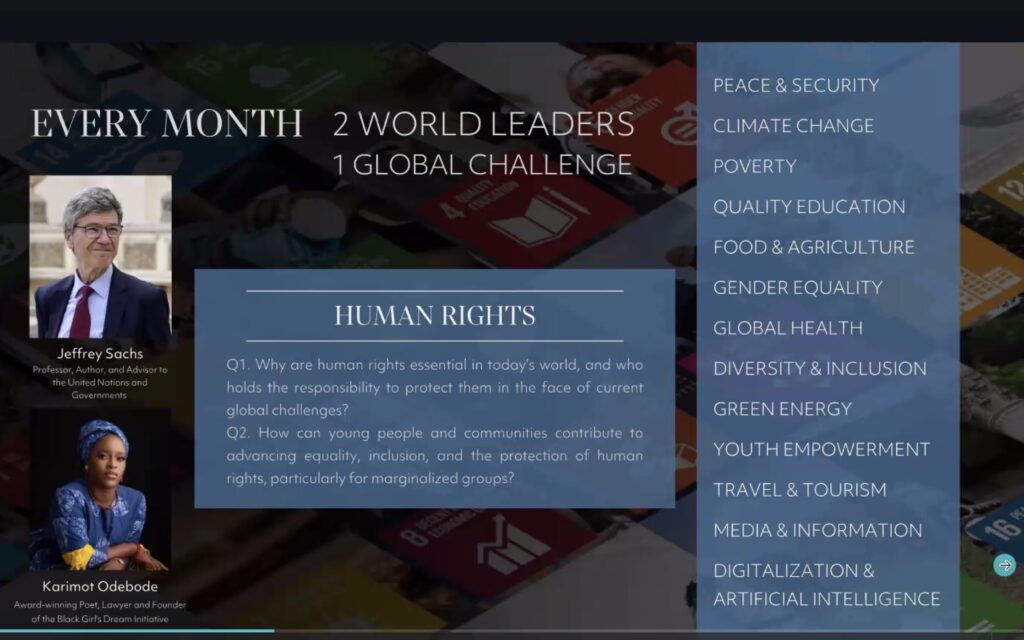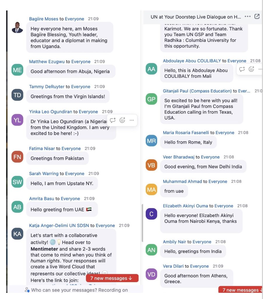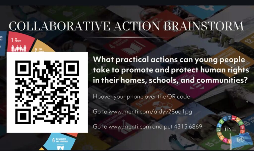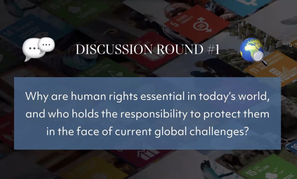 Organised monthly by the United Nations in cooperation with Compass Education, the webinars are designed to give high schoolers a “unique opportunity to engage directly with world leaders and UN officials on how to solve humanity’s greatest challenges.” This month’s webinar focussed on two questions: 1. Why are human rights essential in today’s world, and who holds the responsibility to protect them in the face of current global challenges? 2. How can young people and communities contribute to advancing equality, inclusion, and the protection of human rights, particularly for marginalized groups?