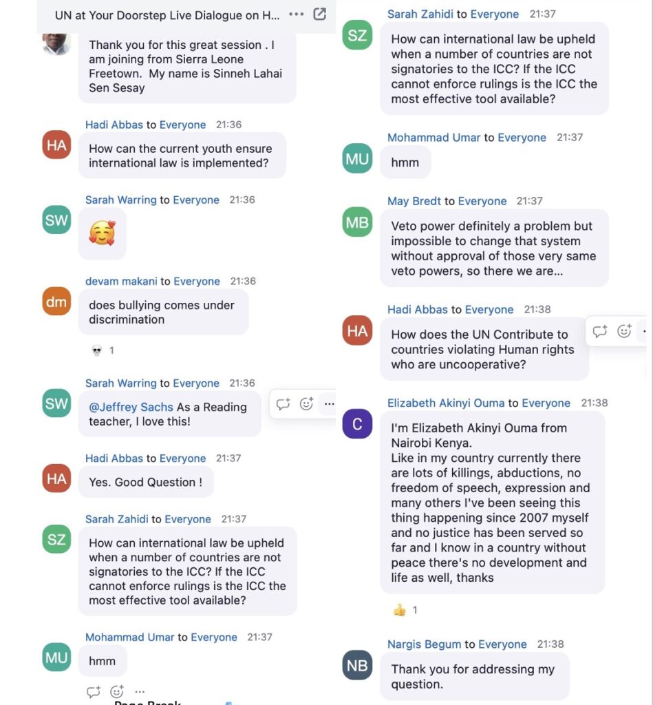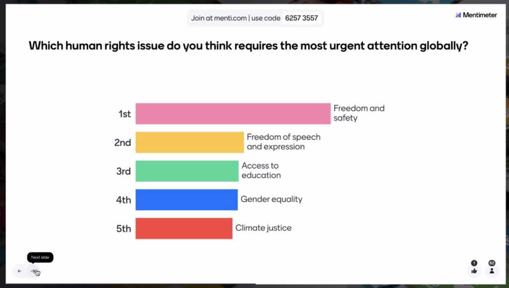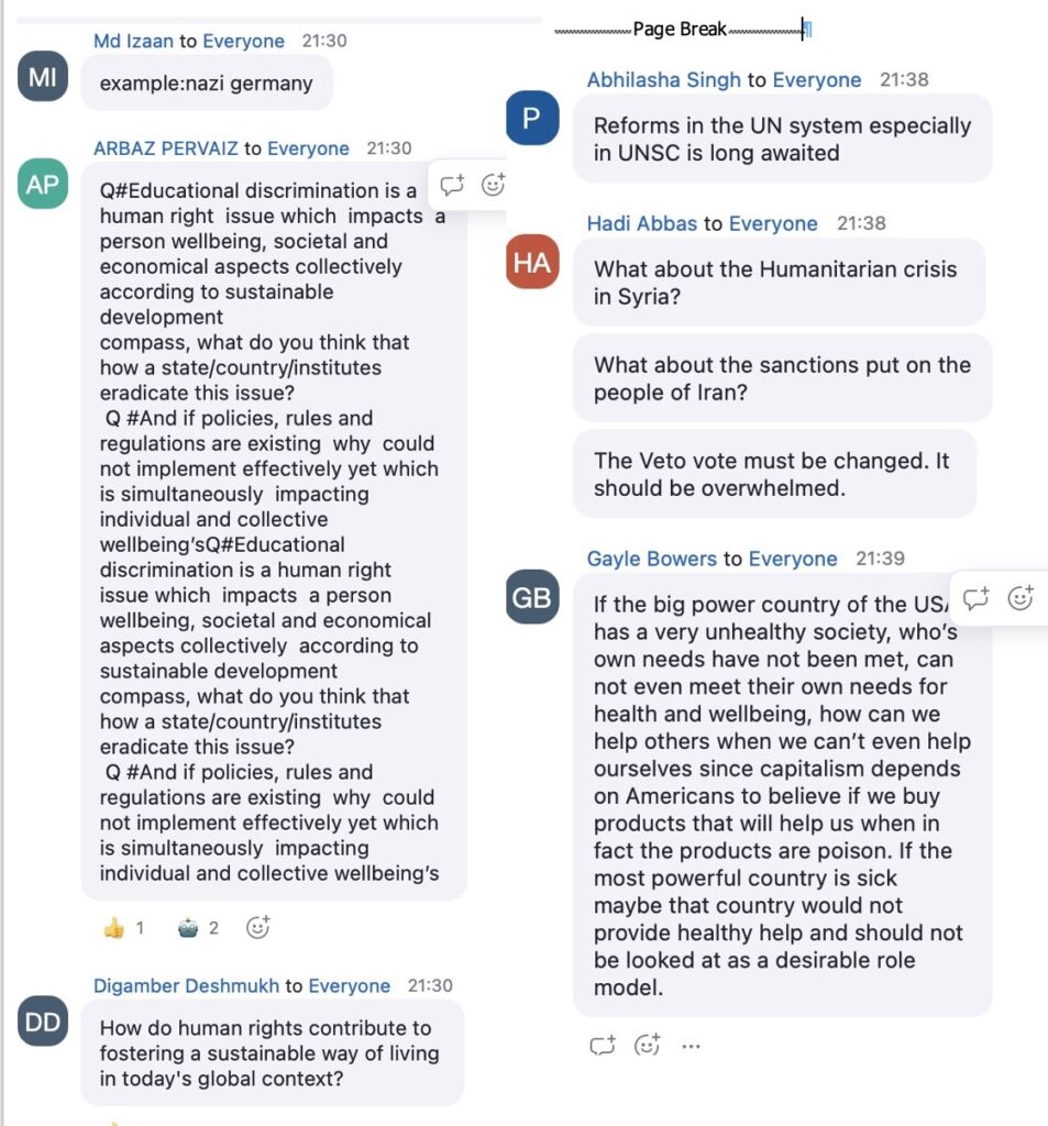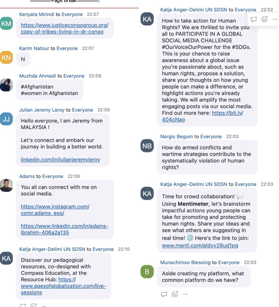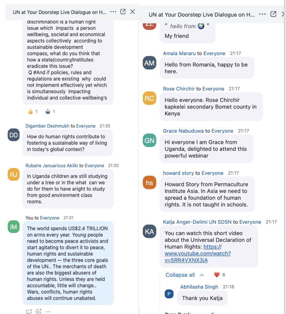 Organised monthly by the United Nations in cooperation with Compass Education, the webinars are designed to give high schoolers a “unique opportunity to engage directly with world leaders and UN officials on how to solve humanity’s greatest challenges.” This month’s webinar focussed on two questions: 1. Why are human rights essential in today’s world, and who holds the responsibility to protect them in the face of current global challenges? 2. How can young people and communities contribute to advancing equality, inclusion, and the protection of human rights, particularly for marginalized groups?