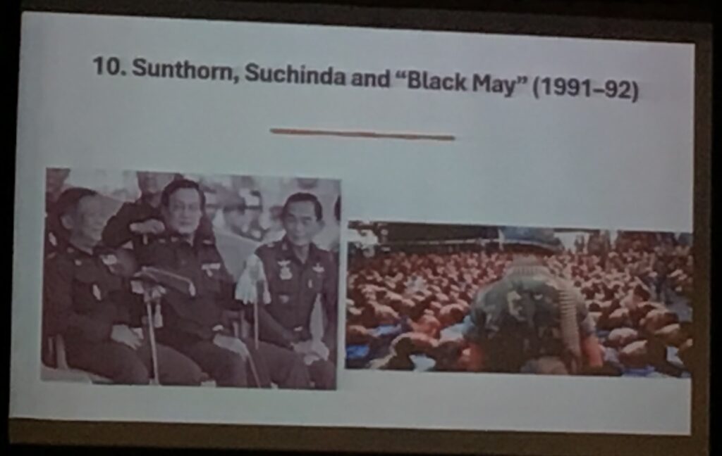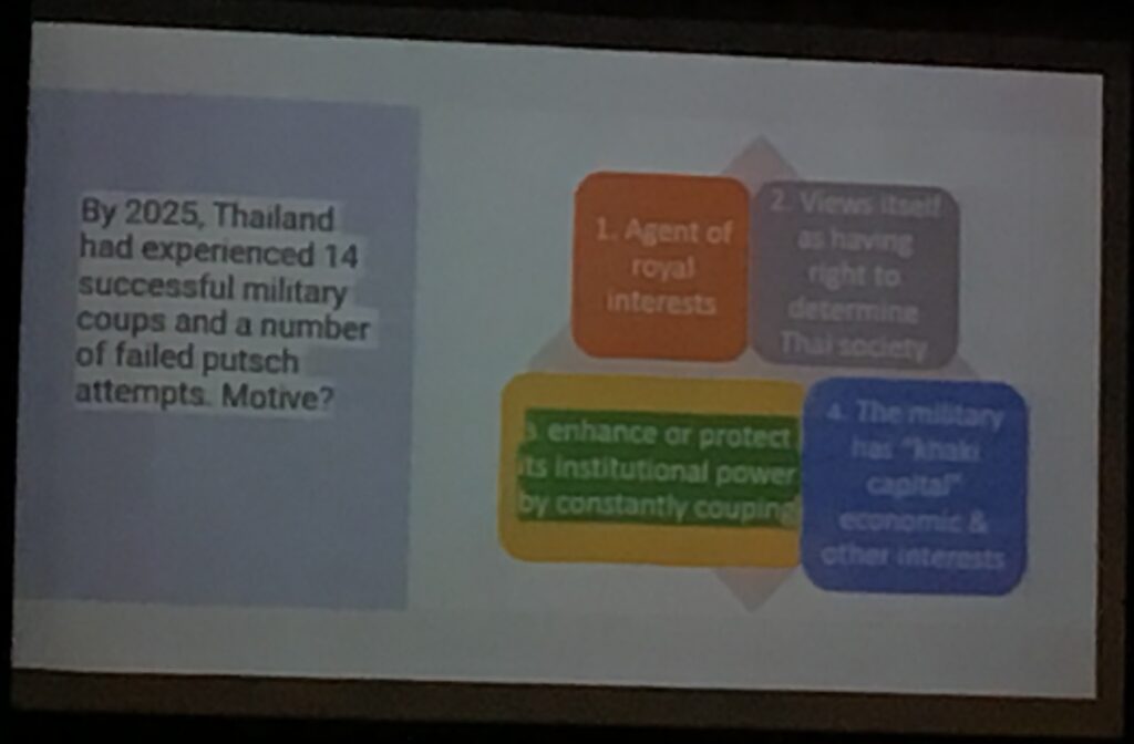 He also asked four secondary questions: 1) Have there ever been security-sector reform efforts, and have they ever taken hold? 2) Why does Thailand’s military remain such an obstacle to democratization in 2023? 3) What has been the history of military-monarchy relations in Thailand? 4) And how have senior military officials intervened in Thai democratization efforts?