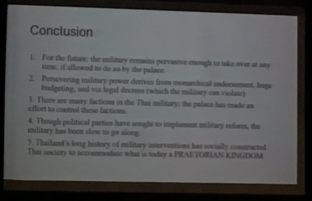 In his introduction to the nearly 700-page book, Prof Chambers said he set out to answer three principal questions over the seven-year research effort: 1) Why did Thailand evolve to become a praetorian kingdom? 2) What is the detailed history of Thai praetorianism? And 3) Why has Thai military influence across politics never been curtailed?