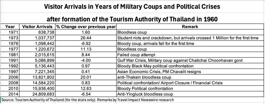 The above figures are well worth more detailed academic research. In general, however, the more violent the confrontation, the worse the impact. In some years where visitor arrivals have risen in spite of a coup or political clash, such as 2010, it is because the arrivals were already high before the crisis and then bounced back after the Travel & Tourism industry mobilised its recovery campaigns.
