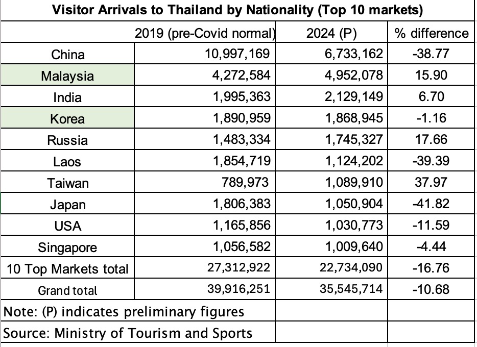 As the full figures for 2024 for all markets are released in a few weeks, more insights will emerge about prevailing trends. But there are clear signs that Thailand is reaching a saturation point in attracting visitors from many countries, and will have to seriously rejig its entire future gameplan.