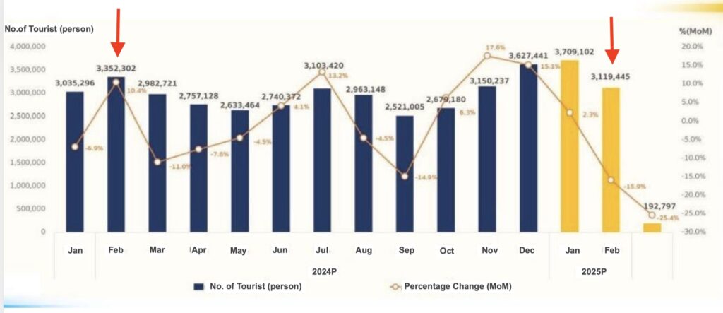 Bangkok – Visitor arrivals to Thailand fell precipitously across the board to 3,119,445 in February 2025, a cumulative 15.9% decline over January 2025. Of the 91 source-markets covered by the Ministry of Tourism and Sports in the official statistics, declines were reported in arrivals from 73 countries and territories, including all the major generators such as China, India, Russia, all the ASEAN countries, and Europe.
