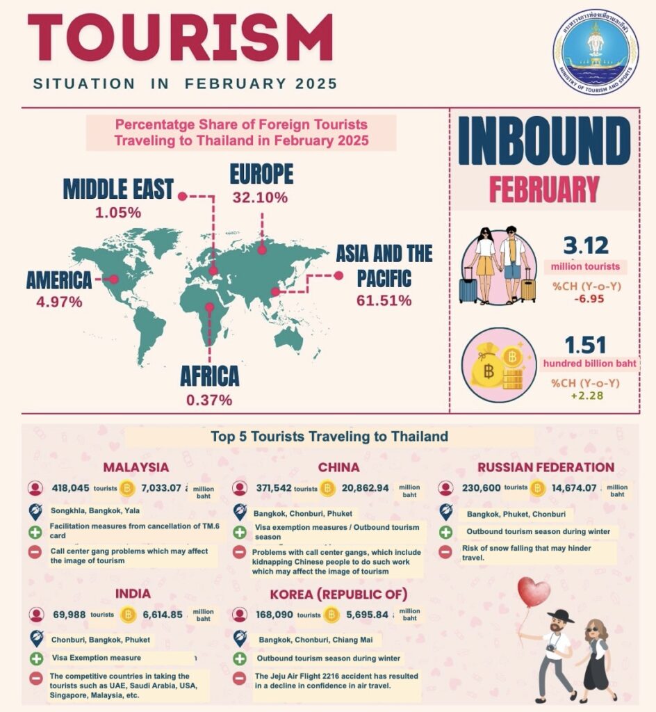 The February 2025 decline is being largely attributed to the fall in arrivals from China after the extensive news reports of security fears, the cancellation of a concert by a popular Chinese performer and Chinese-operated scam-centers in the border regions with Myanmar.